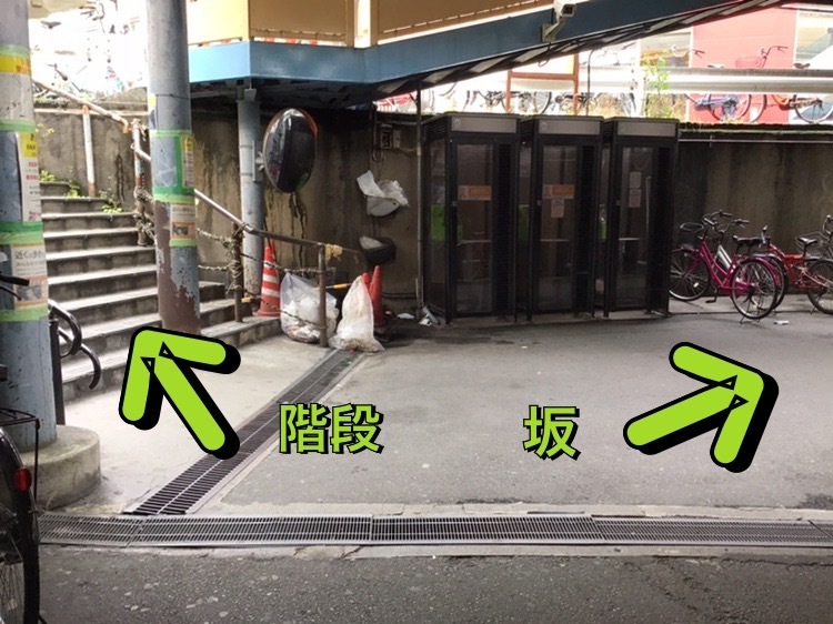真っ直ぐ行くと、写真様に左側に階段右側に坂があります。
