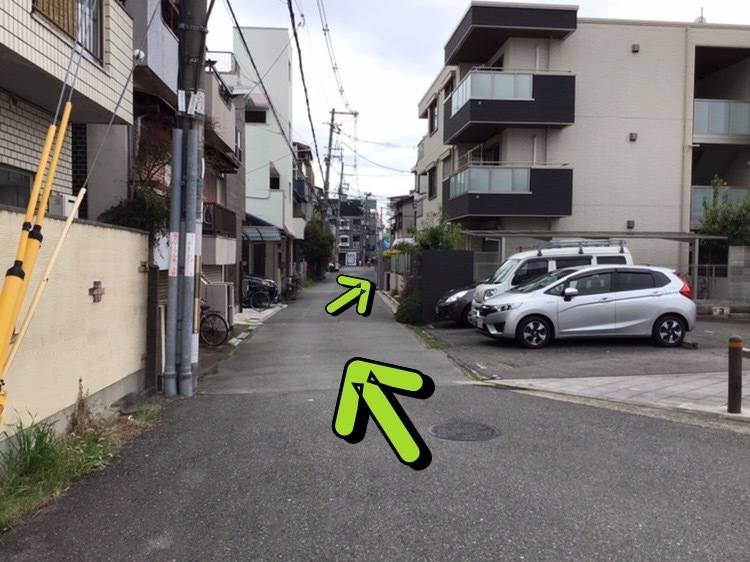 角を曲がった後は、道路を渡り矢印の所へ入って下さい。
