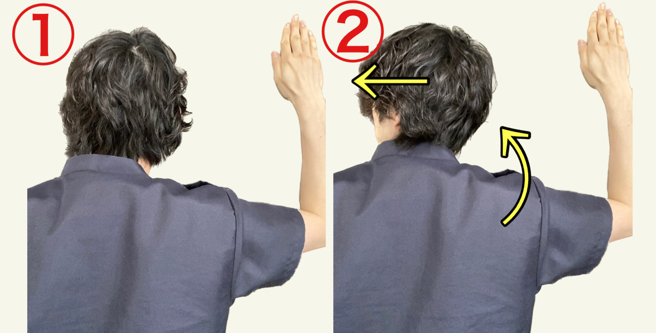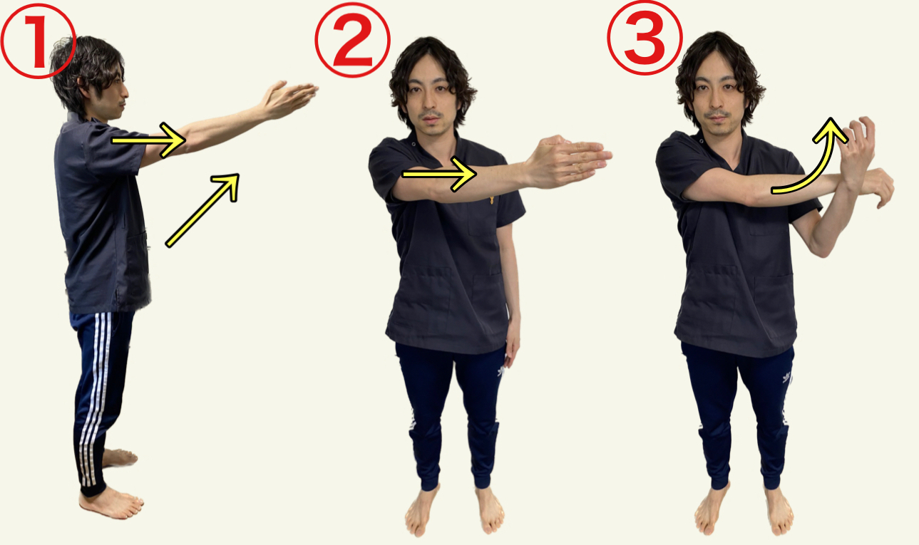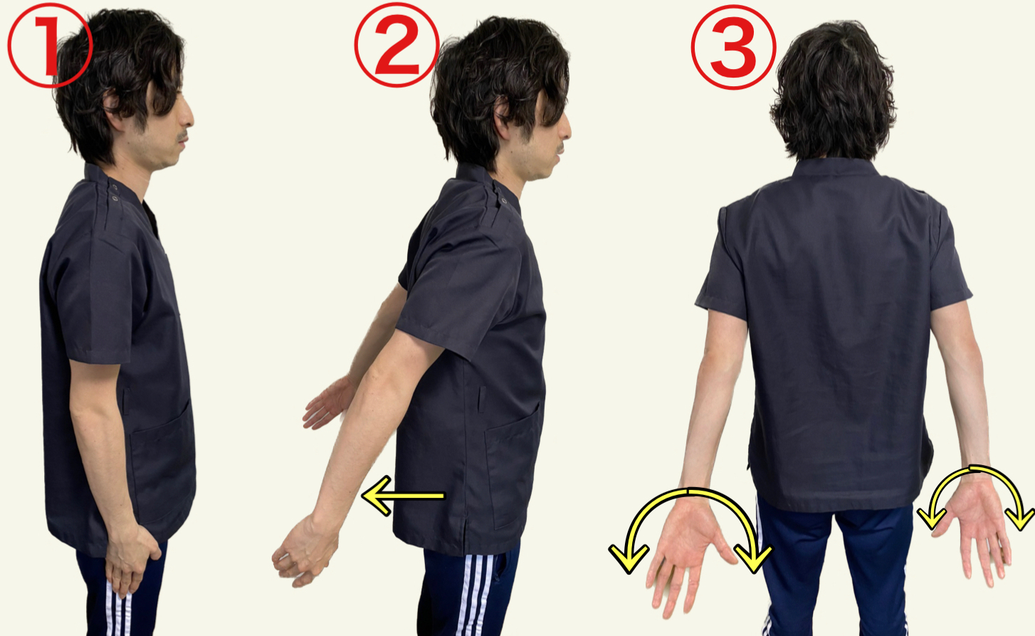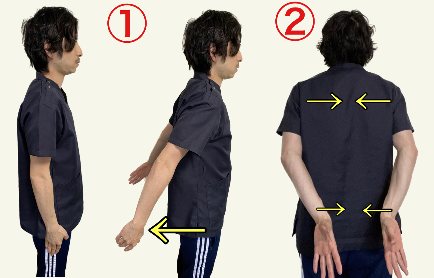 ②腕を内へ捻り手の甲を合わせる様に肩甲骨を寄せる