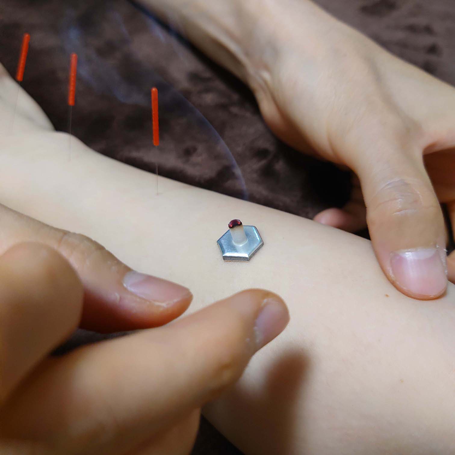 - こちらも同じく身体のツボを刺激するために、もぐさを患部へ置いて火をつけます。もぐさはよもぎから作られており、このよもぎの精油成分がほどよい熱さでじっくりと身体を温めてくれるのです。