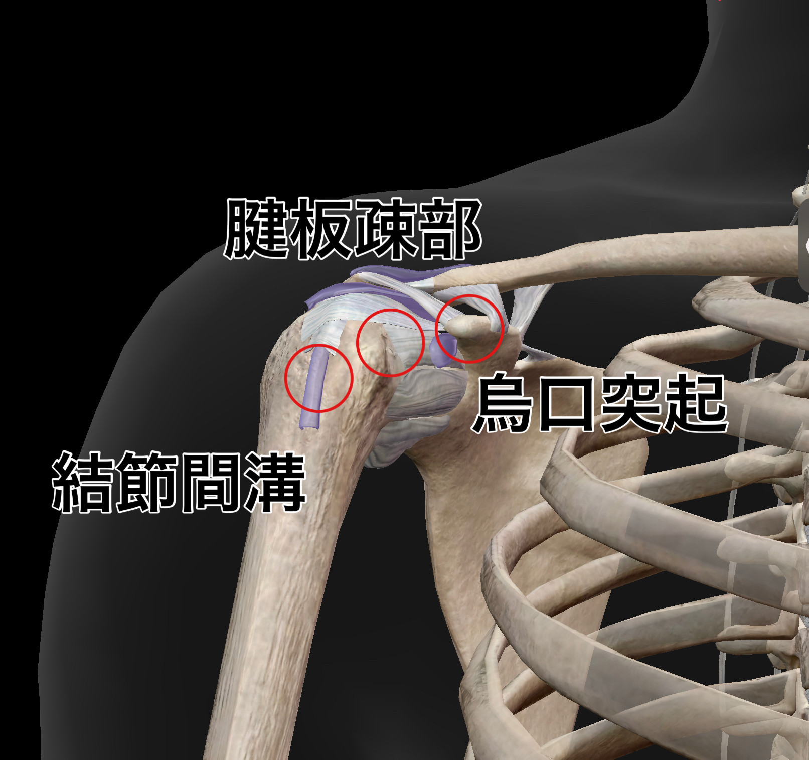 烏口突起の周りは腱板疎部と呼ばれ,この近くで軽微な損傷が起きます。