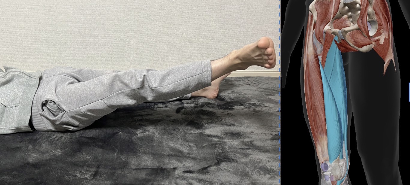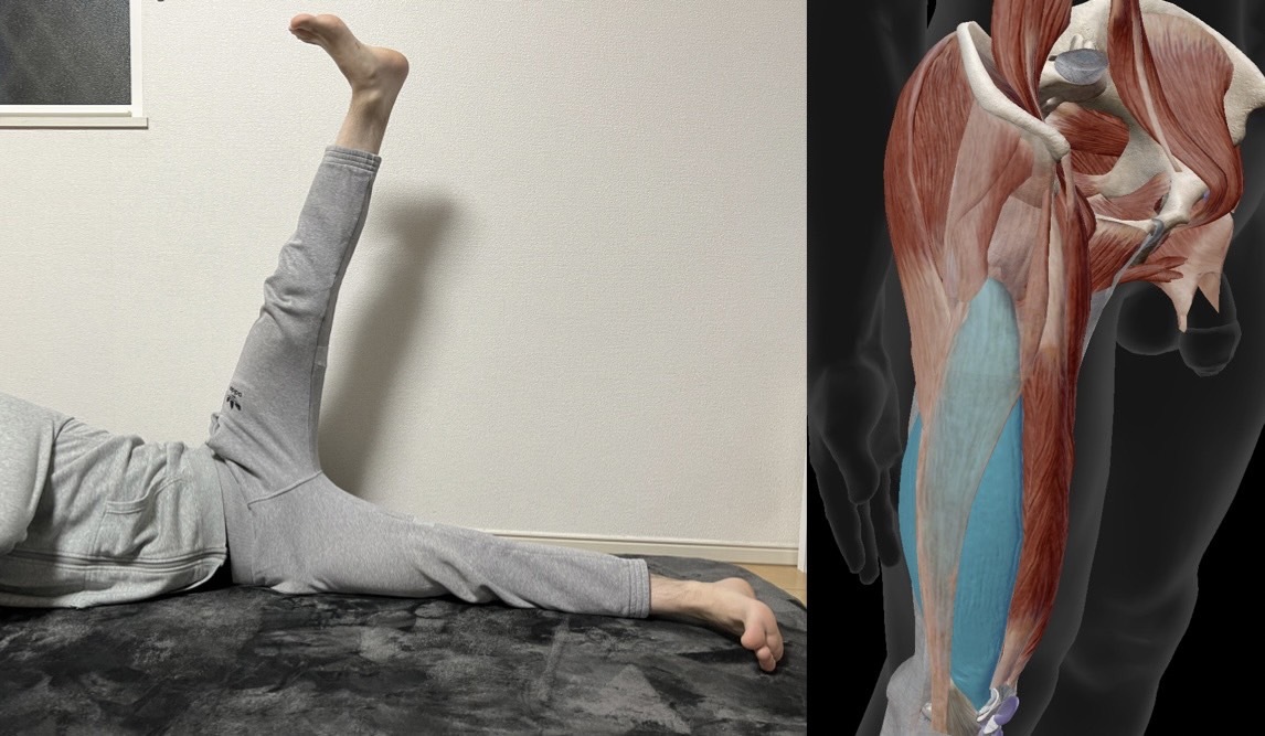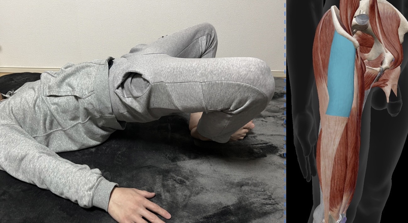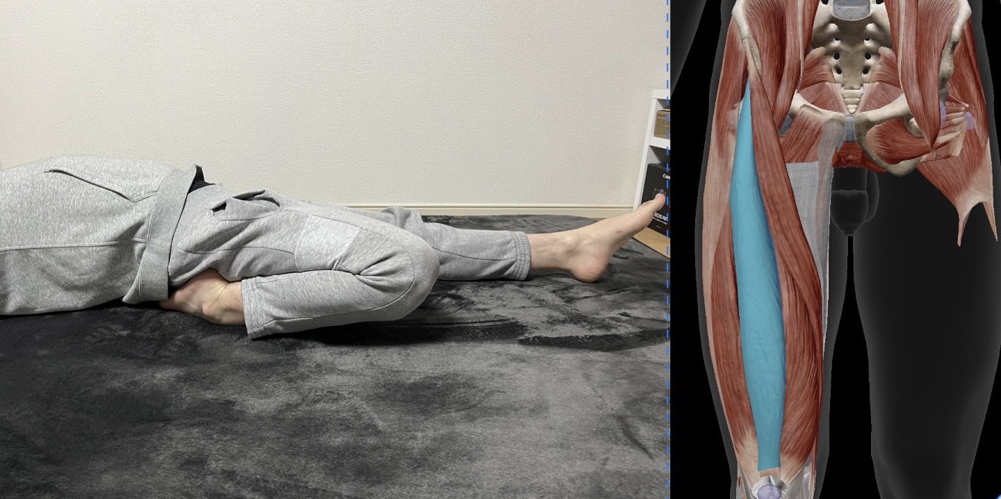 1.横向きに寝て上の足を膝を曲げて前に持ってきます。