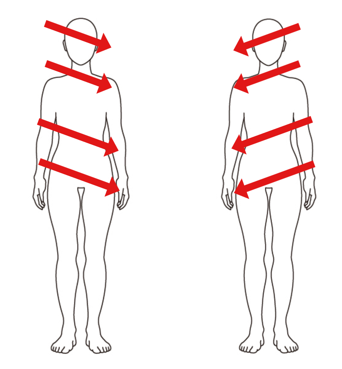 上記の2種類がありこれらの捻れ方に一定の法則があり体は代償(バランスを保つ)をして体の捻れを補正します。